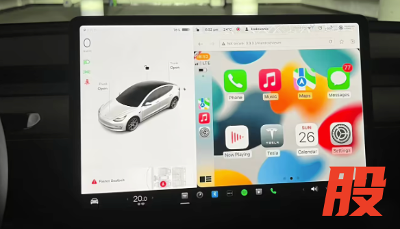 与传统车企让CarPlay接管全屏的模式不同,特斯拉的方案明确了系统分工:中控屏幕左侧三分之一区域及底部导航栏由特斯拉原生系统控制,持续显示车速、电量、空调状态及Autopilot/FSD(完全自动驾驶)等核心驾驶信息。